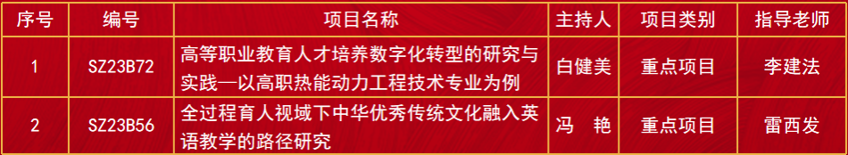 近日,中国职业技术教育学会公布了2023年职业教育课题立项名单,本年度全国共有多所高校、近500个项目提交了项目申报书,最终有90项通过评审,正式立项,神木职院两个项目:《 高等职业教育人才培养数字化转型的研究与实践—以高职热能动力工程技术专业为例》和《全过程育人视域下中华优秀传统文化融入英语教学的路径研究》成功立项。