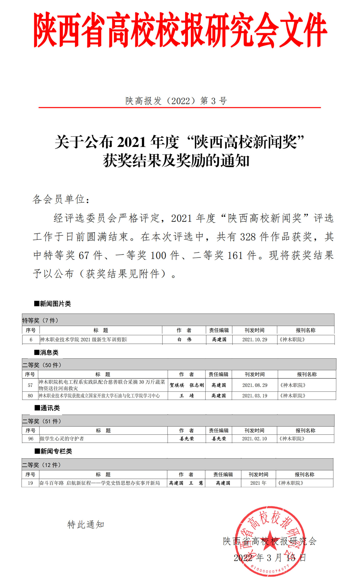 3月15日,2021年度“陕西高校新闻奖”评选结果揭晓,365上市公司官网报送的5件参评作品获奖。其中,特等奖1项,二等奖4项。
