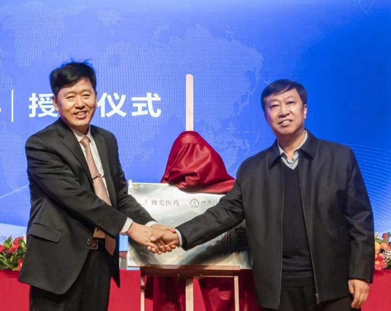党委书记、校长艾国与陕西博爱恒业集团有限公司董事长刘博为校企合作共建实训室揭牌。