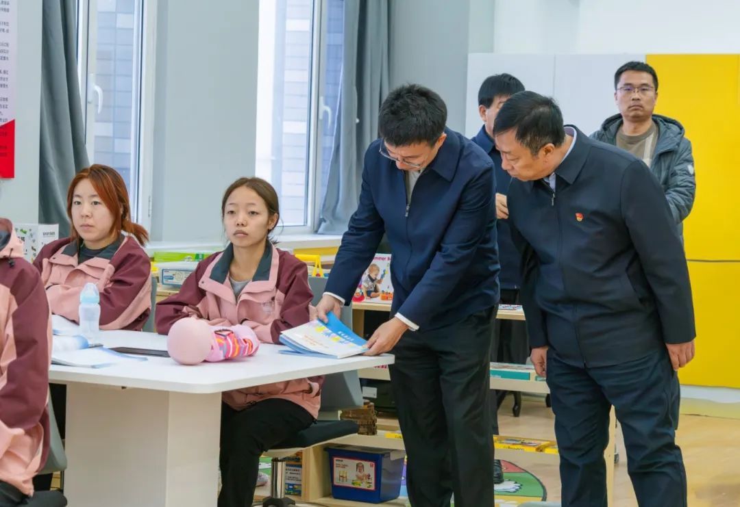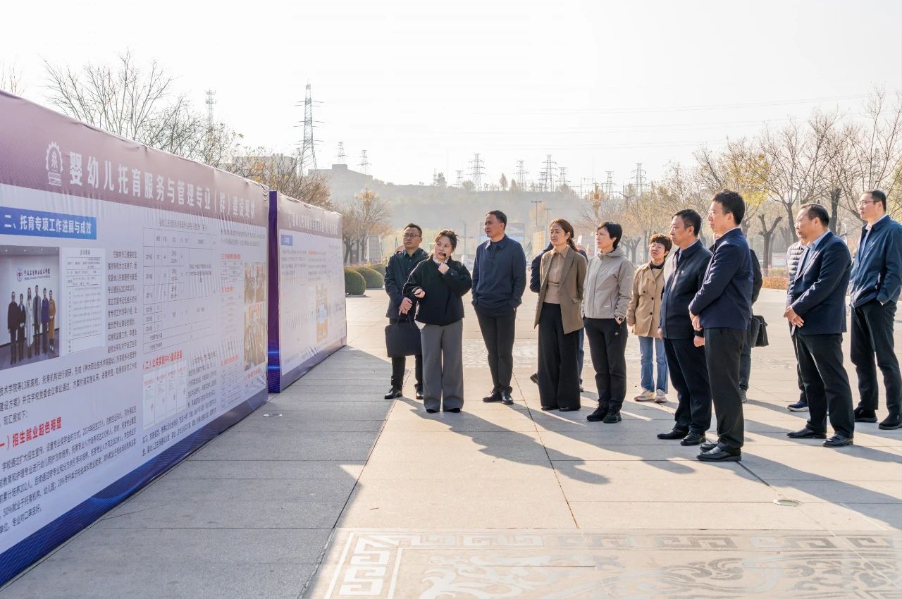 11月7日,国家卫生健康委人口家庭司司长杨文庄一行到学校调研婴幼儿托育服务与管理专业(群)建设工作,陕西省卫健委党组成员、副主任薛寒,榆林市政协副主席高怀和,校党委书记艾国,神木市政府副市长贺建生等一同调研。