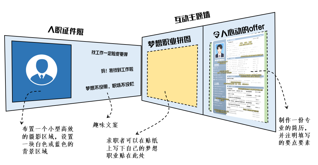 3.互动主题墙,一面是梦想职业拼图,到访的求职者可以写下自己的梦想职业,另一面是“令人心动的offer”的简历墙,制作一份专业的简历,并注明填写的要点要素,供求职者参考打卡。