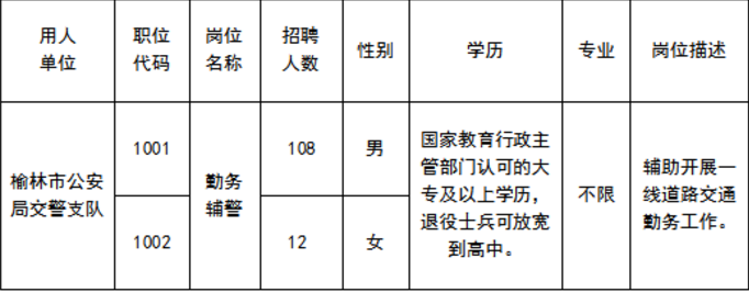 根据《榆林市公安机关警务辅助人员管理实施细则(试行)》的规定,因工作需要,经市政府同意,榆林市公安局面向社会公开招聘警务辅助人员(以下简称辅警),现将有关事项公告如下: