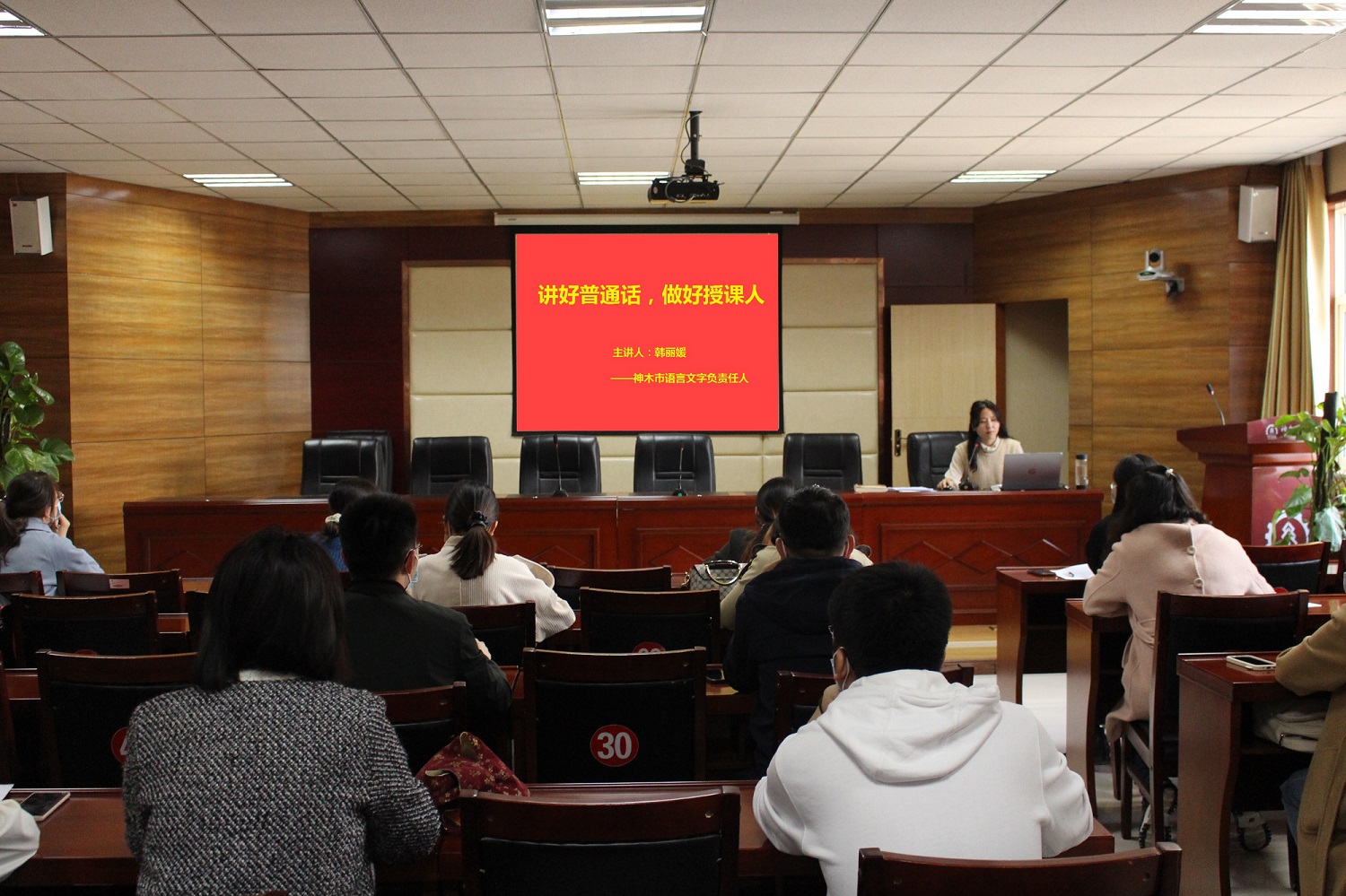 学校邀请了神木市语言文字委员会办公室负责人韩丽媛老师主讲,韩老师从教师的职业要求、个人发展等方面指出了教师学习普通话、说好普通话的重要意义。接下来从普通话的定义及测试评分标准,声、韵、调、语流音变,轻声、儿化、单音节字、多音节词的发音与朗读等内容对老师们进行指导,通过讲解规范发音要领、示范朗读、学员跟读和现场点评纠错等方式,让老师们全员参与其中,学练结合。参加讲座的教师纷纷表示,通过此次讲座进一步掌握了讲好普通话的基本要领,强化了普通话应用意识,在今后的教学中一定会坚持讲好普通话,树立良好的教师形象。